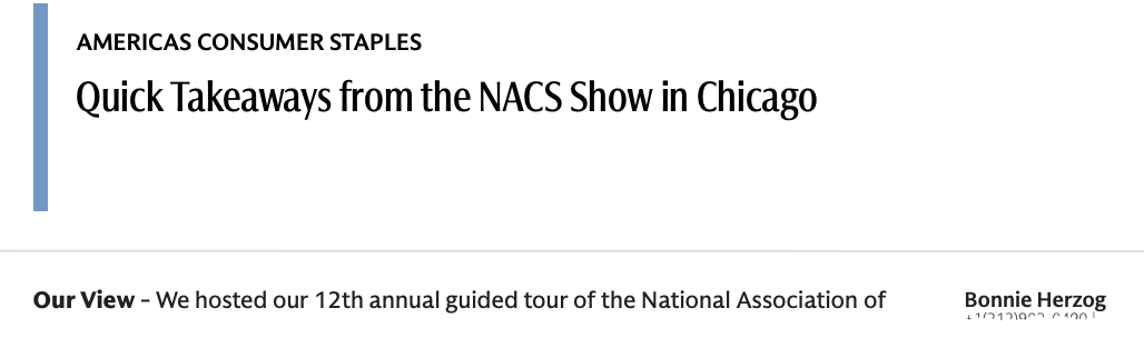 Goldman Sachs analysts hosted their 12th annual guided tour of the National Association of Convenience Stores (NACS) Show in Chicago. Analysts met with executives from major beverage, food, and nicotine companies, including Coca-Cola (KO), PepsiCo (PEP), Constellation Brands (STZ), Boston Beer (SAM), AB InBev (ABI), Monster (MNST), Celsius (CELH), and Hershey (HSY), among others, providing clients with an unparalleled snapshot of current trends across the convenience retail channel.